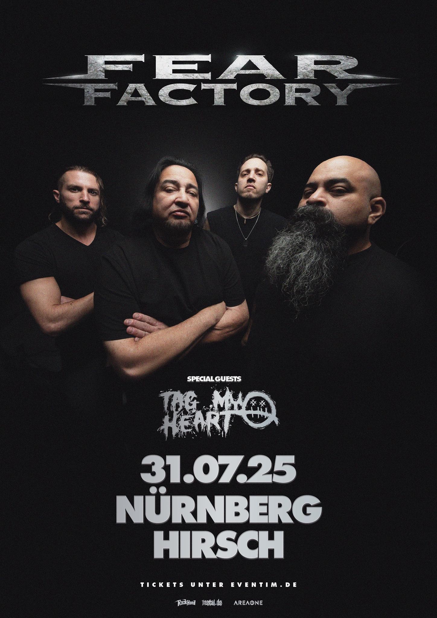 Fear Factory special guest TAG MY HEART Juli 31, 2025 Donnerstag @ 8:00 p.m. Nürnberg, Germany Get Directions Venue Info Address HIRSCH Vogelweierstraße 6690441 NürnbergGermany Website: der-hirsch.com